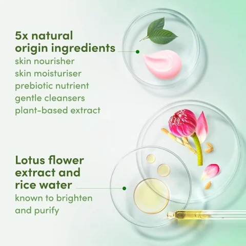 Apa de orez, un ingredient folosit de secole în tradițiile asiatice de îngrijire a pielii, este cunoscută pentru capacitatea sa de a înmuia și netezi pielea, în timp ce contribuie la strălucirea naturală a acesteia. Bogată în antioxidanți și nutrienți esențiali, apa de orez ajută la revitalizarea pielii și la menținerea unui aspect sănătos și luminos. În combinație cu extractul de floare de lotus, aceste ingrediente oferă o îngrijire delicată, dar eficientă, ideală pentru toate tipurile de piele.